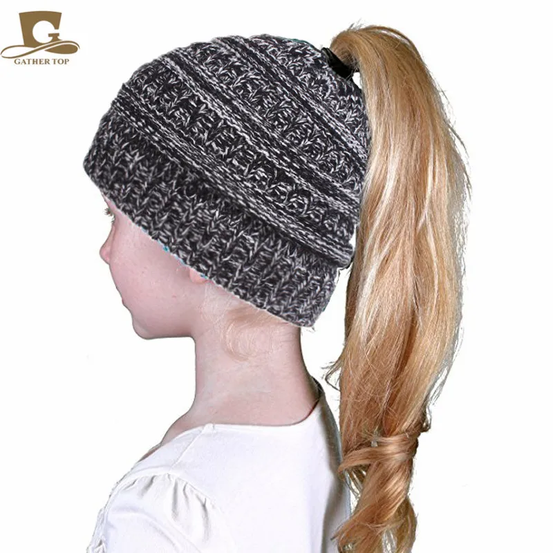 On Sale Hot Baby Girls outdoor ski Beanie Tail Children Warm Winter Knit Caps Kids Ponytail Messy Bun Beanie Solid Ribbed Hat