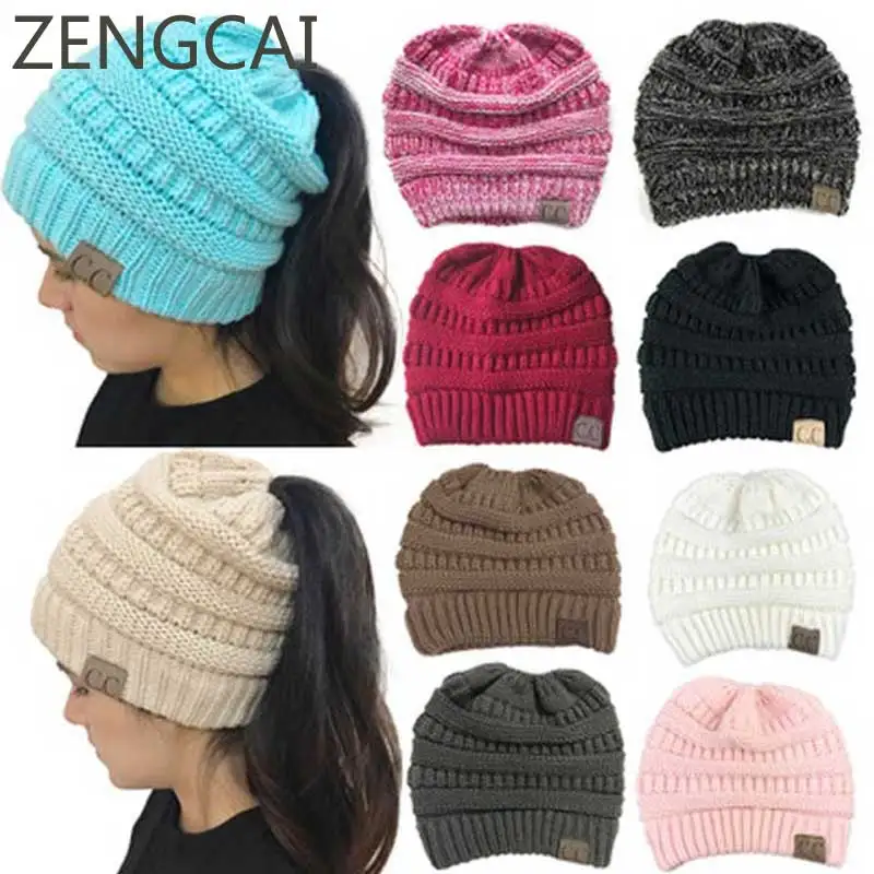 Big SALE CC Ponytail Beanie Hats For Women Winter Cap Knitted Skullies Beanies Warm Caps Female Knit Stylish Girls Hat For Ladies Fashion